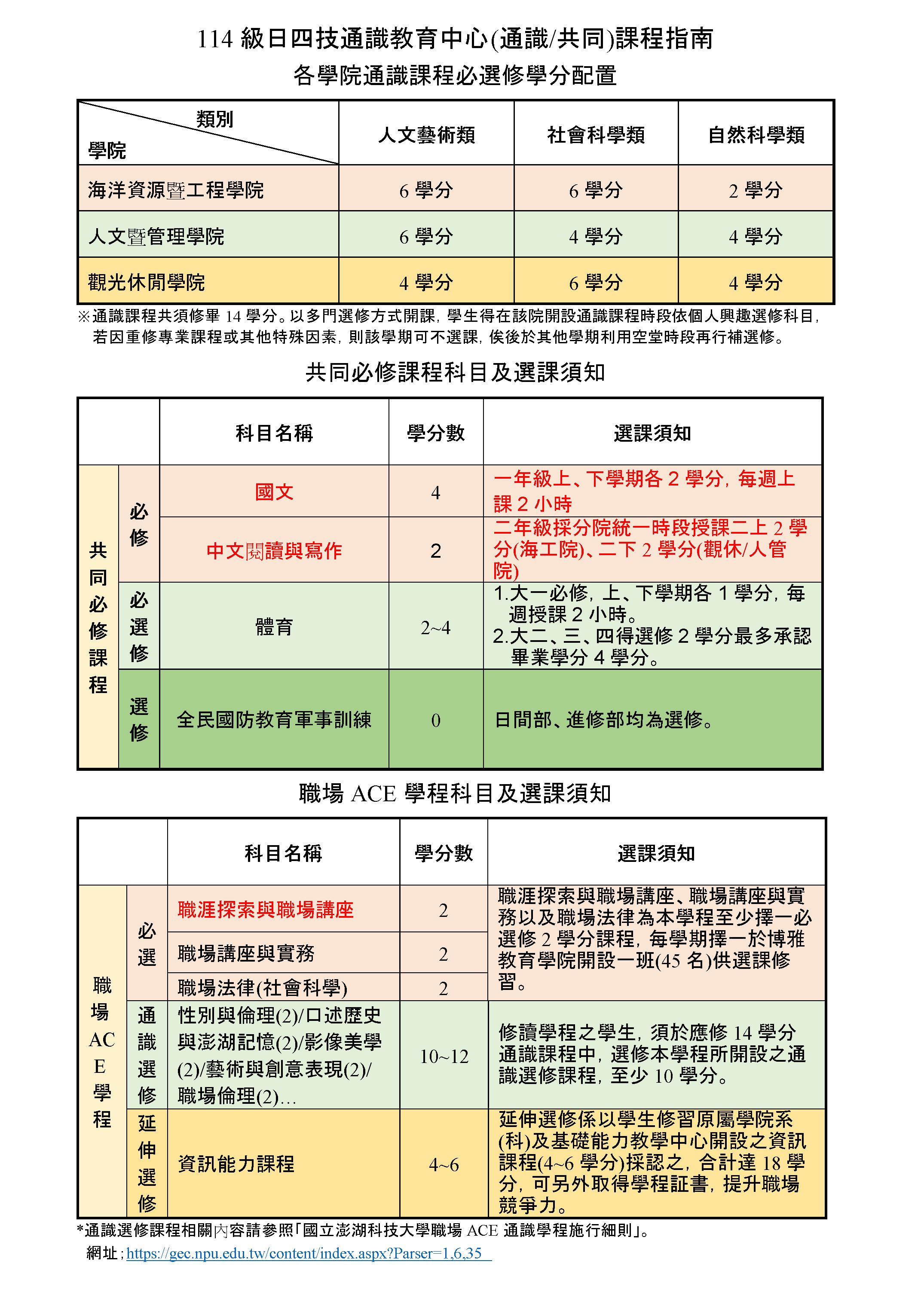本校通識課程學分數如下所列: