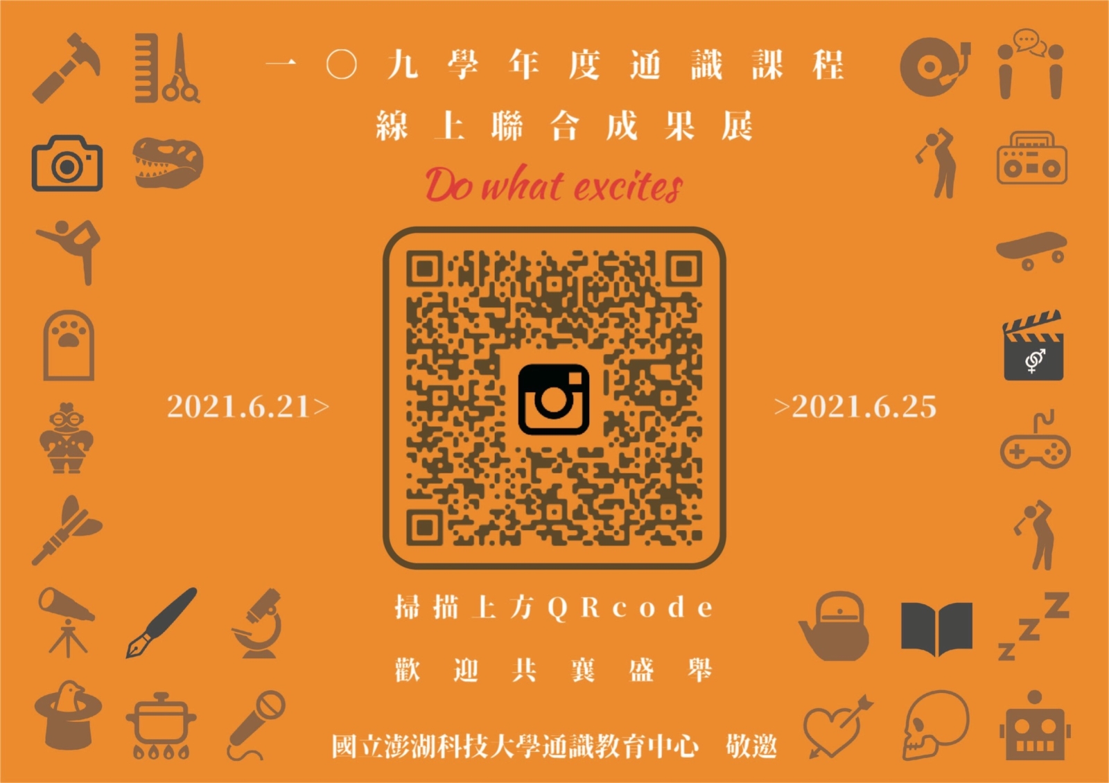 國立澎湖科技大學通識教育中心擬於6月21日起至6月25日止,展出「109學年度通識課程聯合成果展-Do What Excites」,且因應疫情及遵守防疫規定,本次成果展改由線上展出之方式進行,並於6月21日上午8點整準時上線開放參觀,歡迎社區鄉親同好們共襄盛舉。